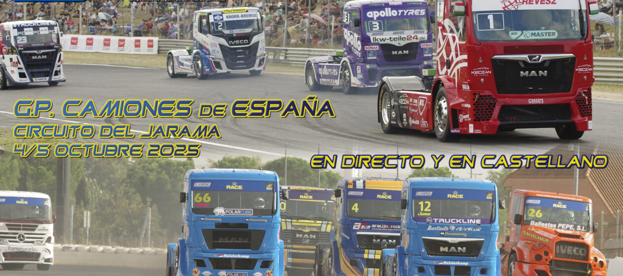 EN DIRECTO ABAJO | Ya está aquí la cita final de la temporada, ya está aquí el Gran Premio de España 2025 en el Jarama con la disputa de la 8ª ronda del ‘European Truck Racing Championship’ y la 2ª del ‘Campeonato de España de Carreras de Camiones’. Y, en esta ocasión, podréis disfrutar de las 8 carreras en directo y en castellano aquí, en TruckRacing.es.