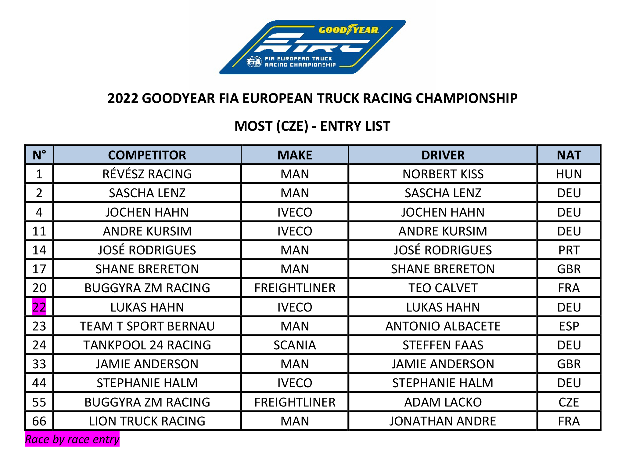Para esta quinta cita del European Truck Racing Championship 2022, tendremos en pista a 14 pilotos.